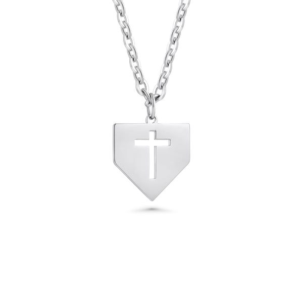 Crafted from sturdy, tarnish-resistant stainless steel, this necklace is made to endure the demands of daily life and remain polished through every season. The pendant is shaped like a baseball home plate diamond, instantly recognizable to fans and players alike. At its center, a hollowed-out cross brings faith into the spotlight, creating a striking blend of devotion to God and passion for America’s pastime.
