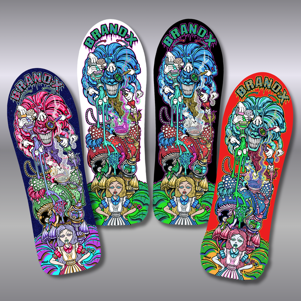 Brand-X DREAM STEALER by Dan Falconer - our second project with Dan is even more amazing than the first - coming in limited edition with hand-done, screen-printed graphics depicting a world of Alice in Wonderland, reimagined by Dan Falconer.