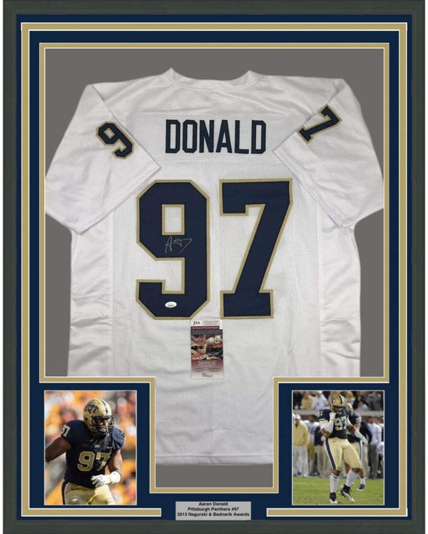 Framed Autographed/Signed Aaron Donald 35x39 Pittsburgh White College Football Jersey JSA COA