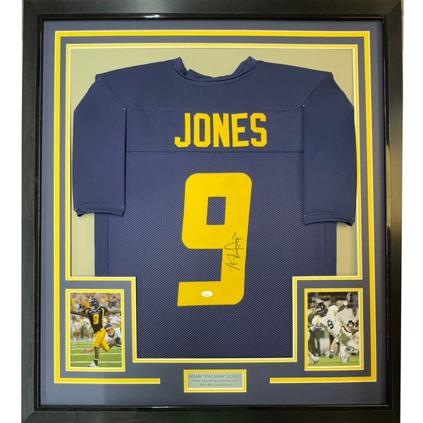 Framed Autographed/Signed Adam Pacman Jones 35x39 West Virginia Blue College Football Jersey JSA COA