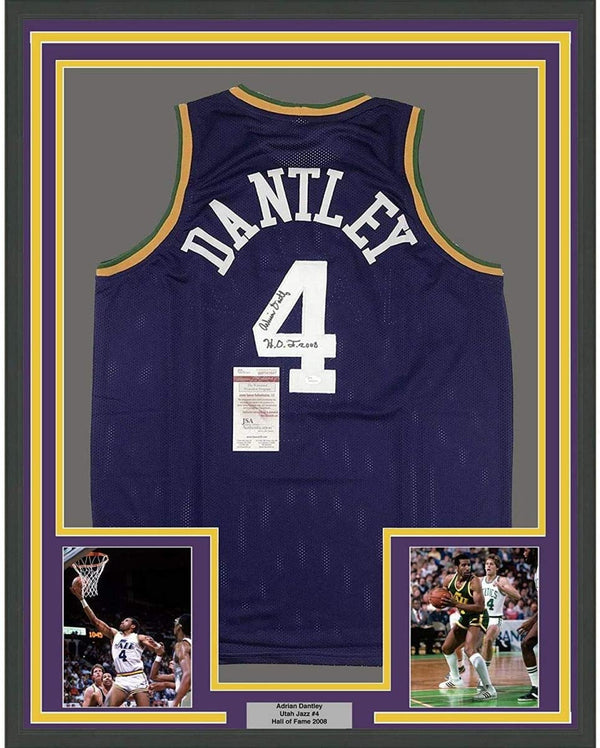 Framed Autographed/Signed Adrian Dantley HOF 2008 35x39 Utah Purple Basketball Jersey JSA COA