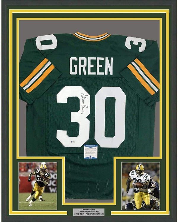 Framed Autographed/Signed Ahman Green 35x39 Green Bay Packers Green Football Jersey JSA COA