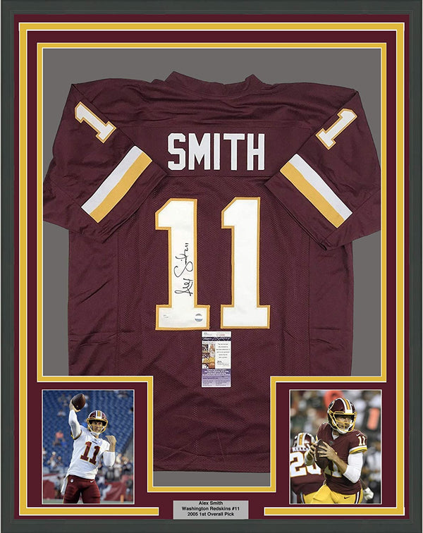 Framed Autographed/Signed Alex Smith 35x39 Washington Burgundy Football Jersey JSA COA