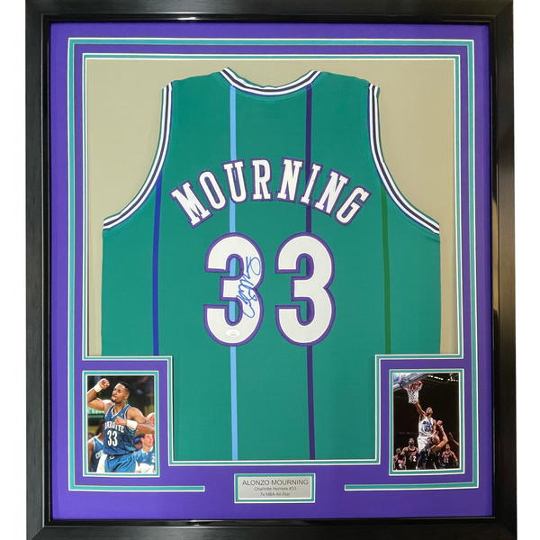 Framed Autographed/Signed Alonzo Mourning 35x39 Charlotte Teal Basketball Jersey JSA COA