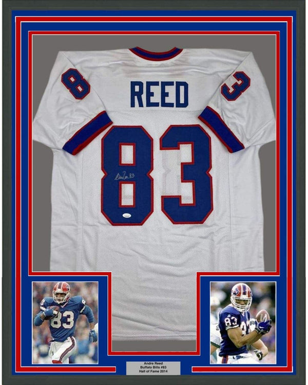 Framed Autographed/Signed Andre Reed 35x39 Buffalo White Football Jersey JSA COA