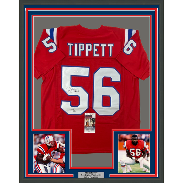 Framed Autographed/Signed Andre Tippett 35x39 HOF 08 New England Red Football Jersey JSA COA