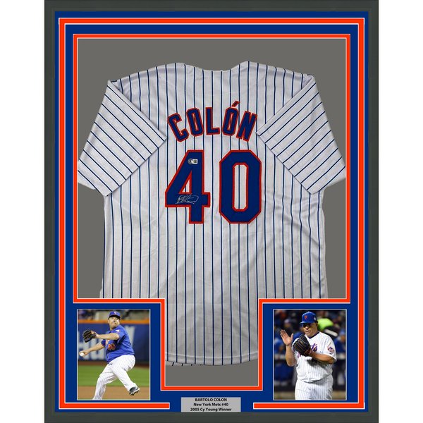 Framed Autographed/Signed Bartolo Colon 35x39 New York Pinstripe Baseball Jersey Beckett BAS COA