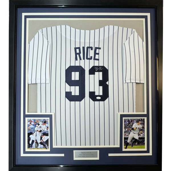 Framed Autographed/Signed Ben Rice 35x39 New York Pinstripe Baseball Jersey JSA COA