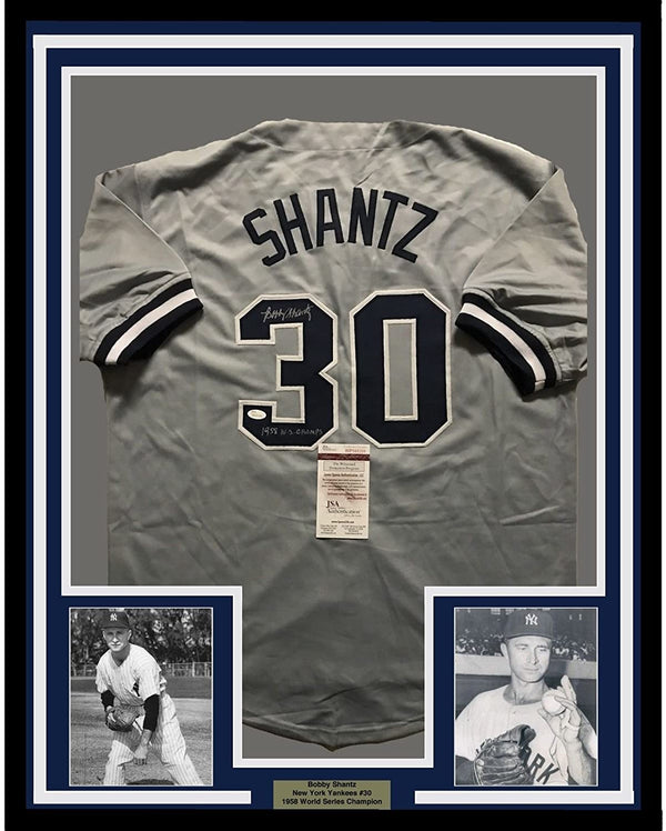 Framed Autographed/Signed Bobby Shantz 35x39 New York Grey Baseball Jersey JSA COA