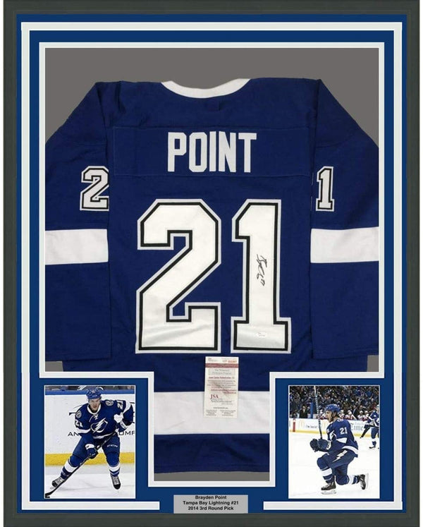 Framed Autographed/Signed Brayden Point 35x39 Tampa Bay Blue Hockey Jersey JSA COA
