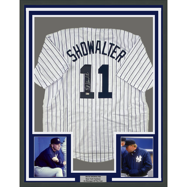 Framed Autographed/Signed Buck Showalter 35x39 New York Pinstripe Baseball Jersey MLB COA