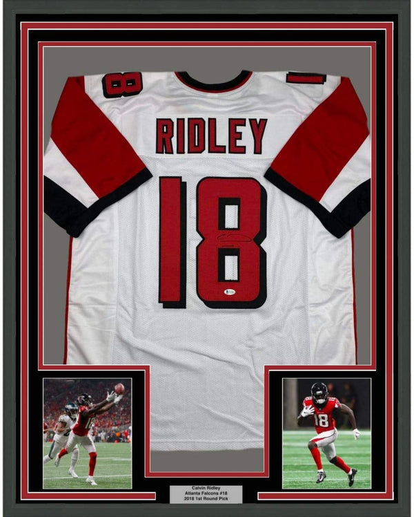 Framed Autographed/Signed Calvin Ridley 35x39 Atlanta White Football Jersey Beckett BAS COA