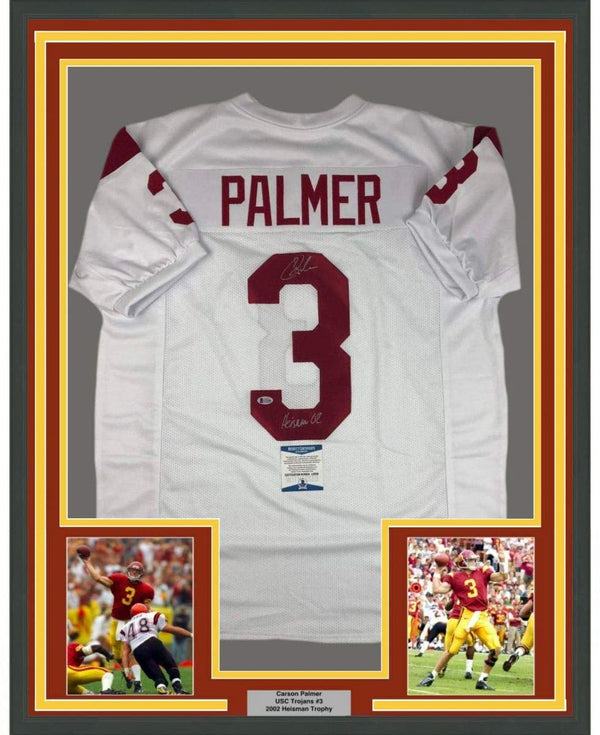 Framed Autographed/Signed Carson Palmer Heisman 02 35x39 USC Southen Cal White College Football Jersey Beckett BAS COA