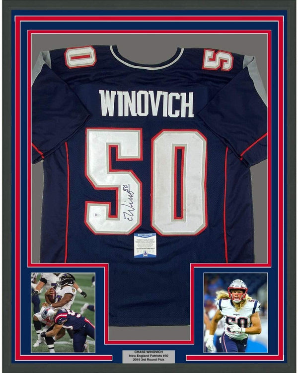 Framed Autographed/Signed Chase Winovich 35x39 New England Blue Football Jersey Beckett BAS COA