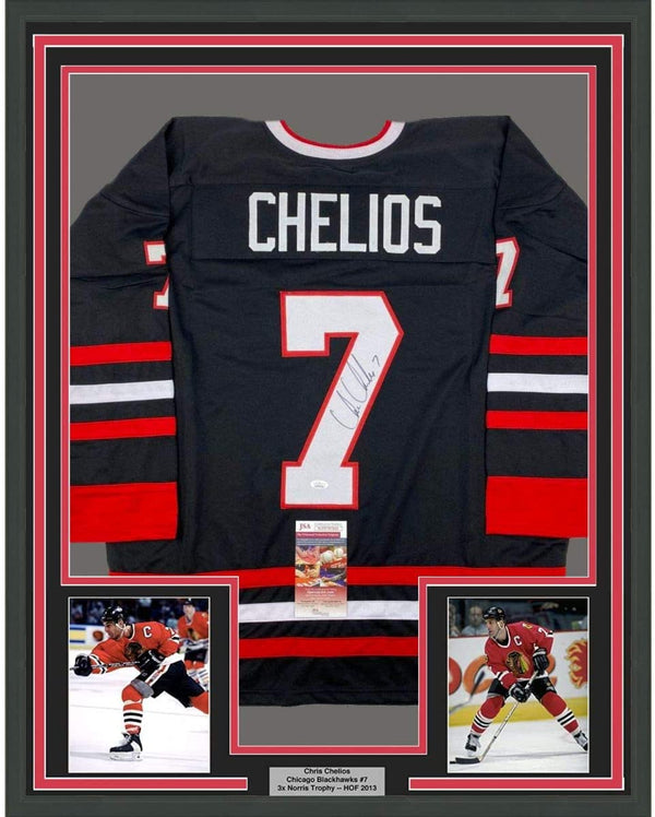Framed Autographed/Signed Chris Chelios 35x39 Chicago Black Hockey Jersey JSA COA