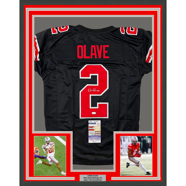 Framed Autographed/Signed Chris Olave 35x39 Ohio State Black College Football Jersey JSA COA