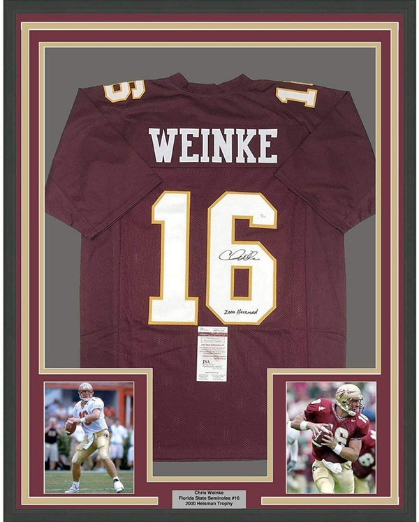 Framed Autographed/Signed Chris Weinke 2000 Heisman 35x39 Florida State Seminoles Maroon College Football Jersey JSA COA