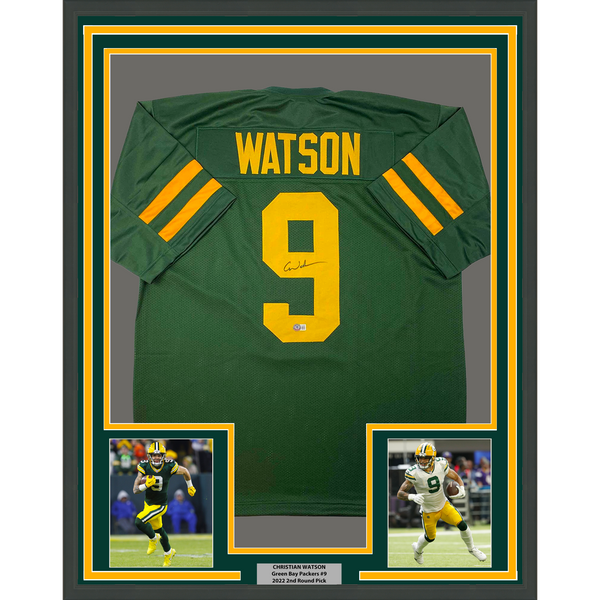 Framed Autographed/Signed Christian Watson 35x39 Green Bay Color Rush Green Football Jersey Beckett BAS COA