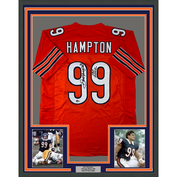 Framed Autographed/Signed Dan Hampton 35x39 HOF 2002 Chicago Orange Football Jersey Beckett BAS COA