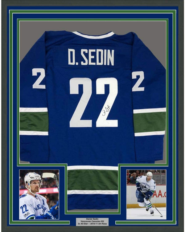 Framed Autographed/Signed Daniel Sedin 35x39 Vancouver Blue Hockey Jersey JSA COA Holo Only