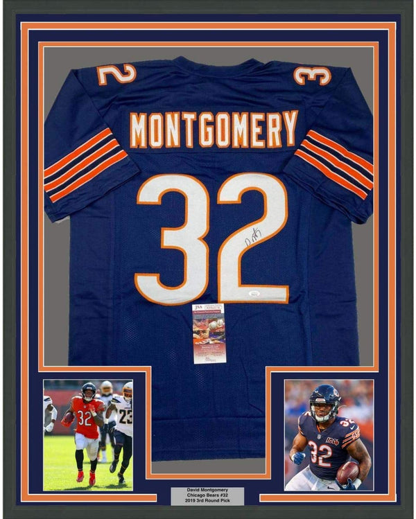 Framed Autographed/Signed David Montgomery 35x39 Chicago Blue Football Jersey JSA COA
