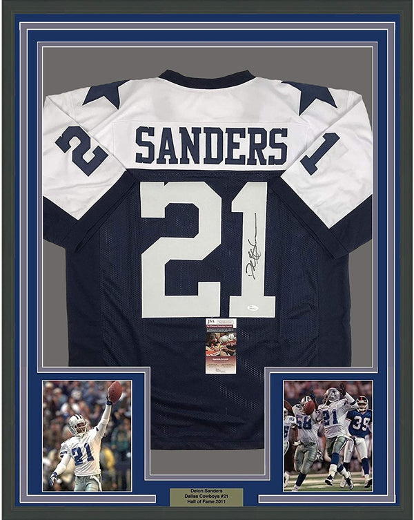 Framed Autographed/Signed Deion Sanders 35x39 Dallas Thanksgiving Day Football Jersey JSA COA