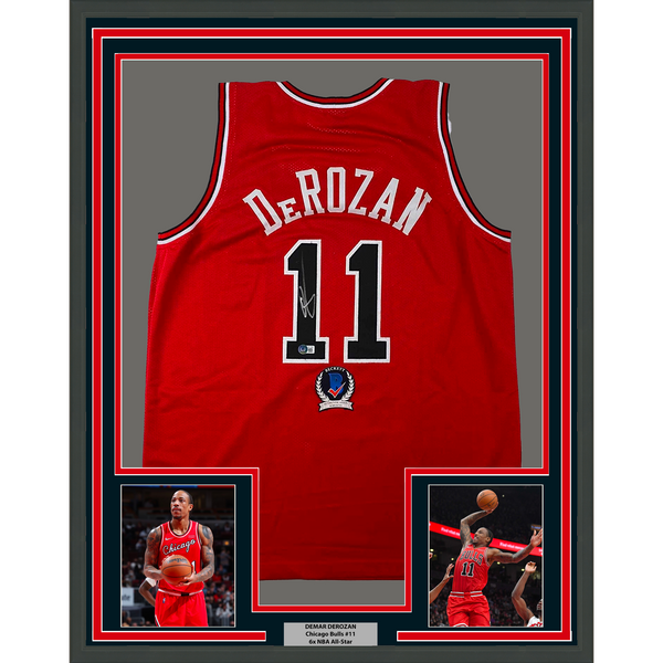 Framed Autographed/Signed DeMar DeRozan 35x39 Chicago Red Basketball Jersey Beckett BAS COA