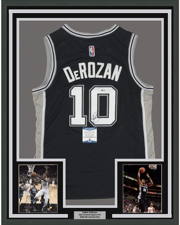 Framed Autographed/Signed DeMar DeRozan 35x39 San Antonio Black Basketball Jersey Beckett BAS COA