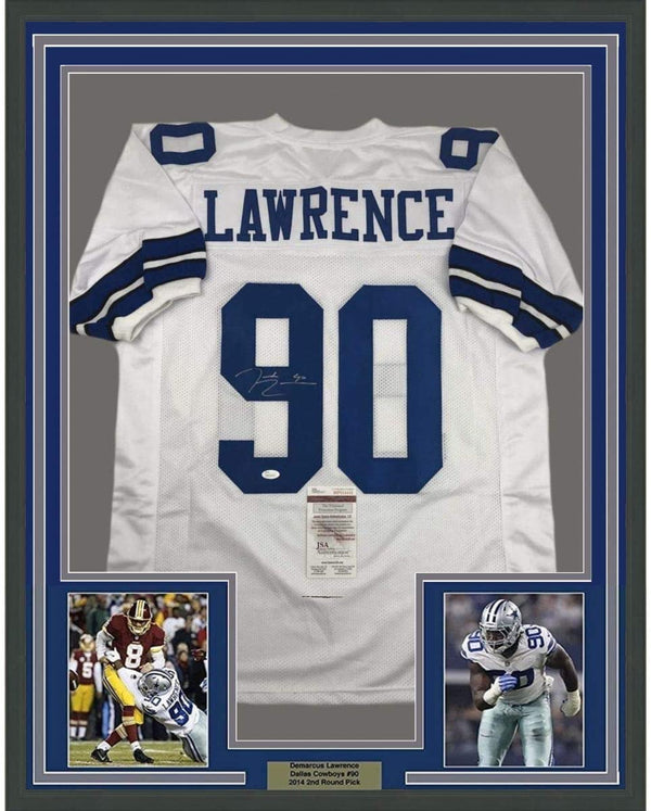 Framed Autographed/Signed Demarcus Lawrence 35x39 Dallas White Football Jersey JSA COA