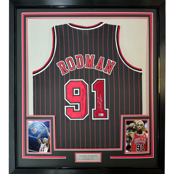 Framed Autographed/Signed Dennis Rodman 35x39 Chicago Pinstripe Basketball Jersey PSA/DNA COA