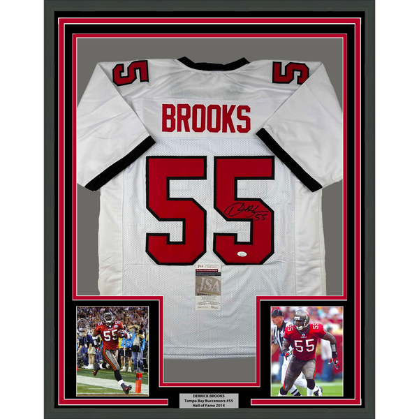 Framed Autographed/Signed Derrick Brooks 35x39 Tampa Bay White Football Jersey JSA COA