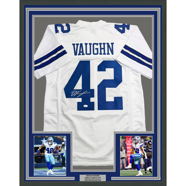 Framed Autographed/Signed Deuce Vaughn 35x39 Dallas White Football Jersey JSA COA