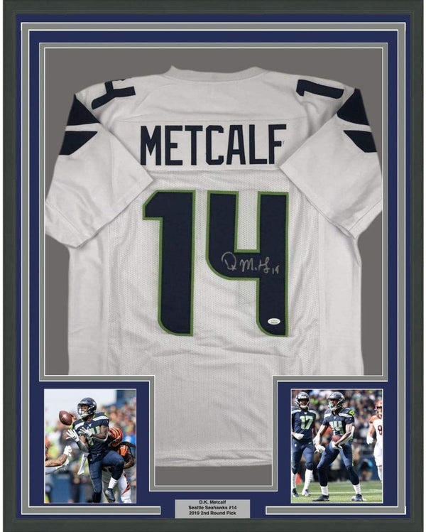 Framed Autographed/Signed DK D.K. Metcalf 35x39 Seattle White Football Jersey JSA COA