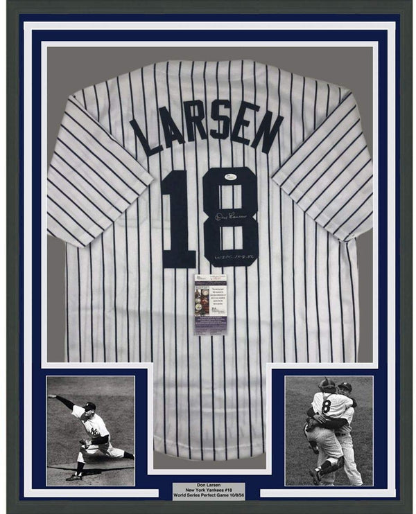 Framed Autographed/Signed Don Larsen 35x39 New York Pinstripe Baseball Jersey JSA COA