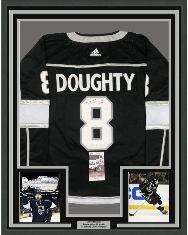 Framed Autographed/Signed Drew Doughty 35x39 Los Angeles LA Black Hockey Jersey JSA COA