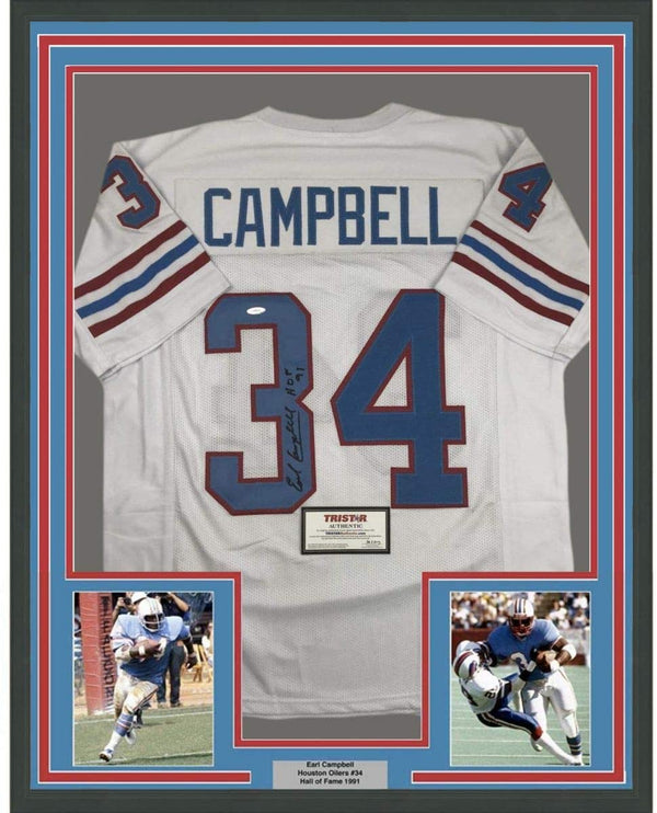 Framed Autographed/Signed Earl Campbell HOF 91 35x39 Houston White Football Jersey Tristar COA