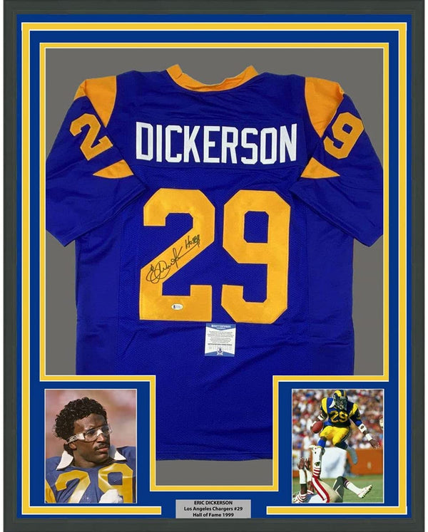 Framed Autographed/Signed Eric Dickerson 35x39 HOF 99 Los Angeles LA Blue Football Jersey Beckett BAS COA
