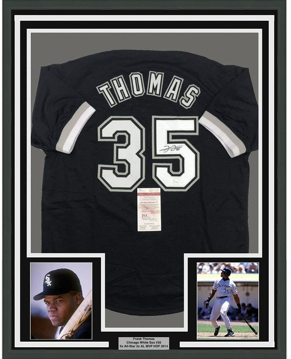 Framed Autographed/Signed Frank Thomas 35x39 Chicago Black Baseball Jersey JSA COA