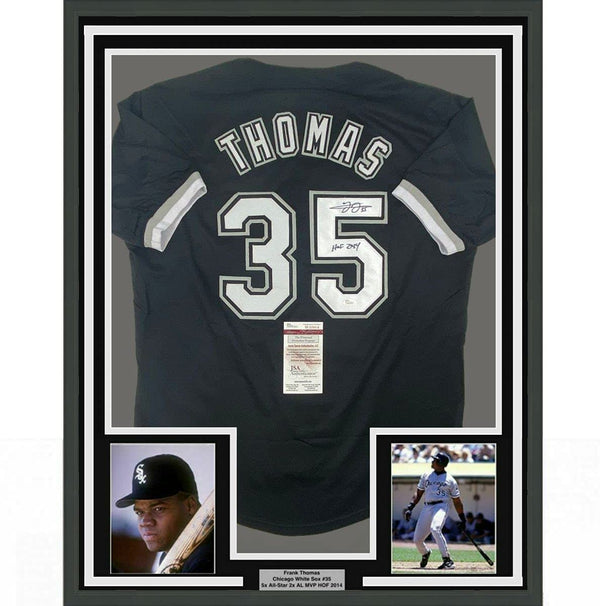 Framed Autographed/Signed Frank Thomas HOF 2014 35x39 Chicago Black Baseball Jersey JSA COA