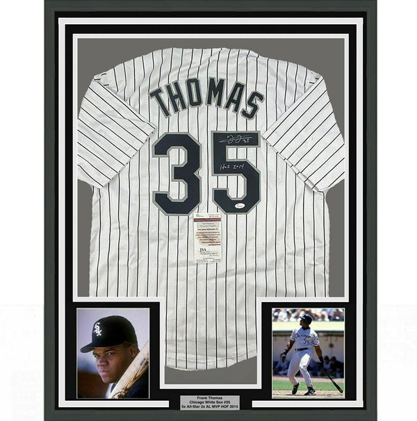 Framed Autographed/Signed Frank Thomas HOF 2014 35x39 Chicago Pinstripe Baseball Jersey JSA COA