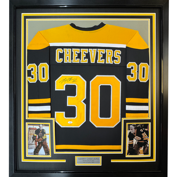 Framed Autographed/Signed Gerry Cheevers 35x39 Boston Black Hockey Jersey JSA COA