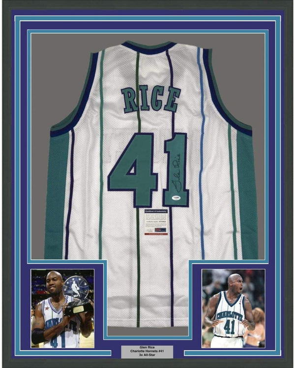 Framed Autographed/Signed Glen Rice 35x39 Charlotte White Basketball Jersey PSA/DNA COA
