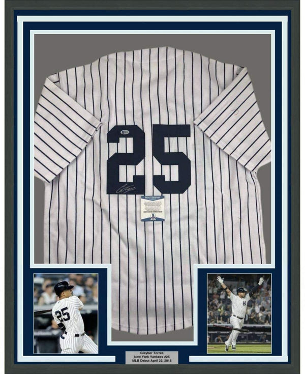 Framed Autographed/Signed Gleyber Torres 35x39 New York #25 Pinstripe Baseball Jersey Beckett BAS COA