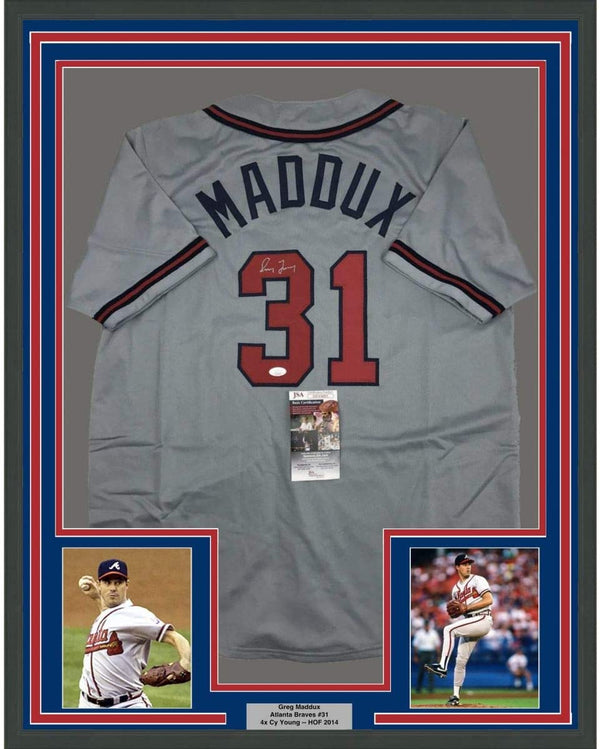 Framed Autographed/Signed Greg Maddux 35x39 Atlanta Grey Baseball Jersey JSA COA
