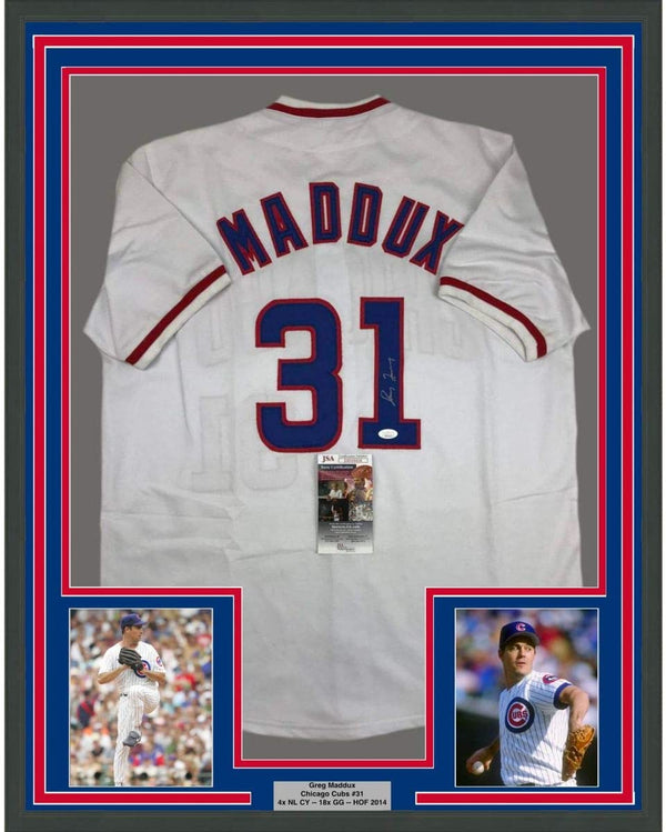 Framed Autographed/Signed Greg Maddux 35x39 Chicago White Baseball Jersey JSA COA