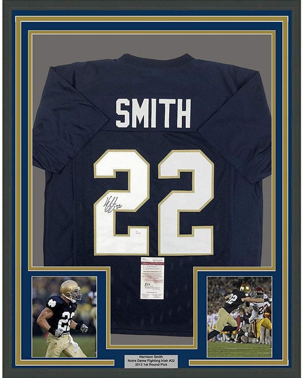 Framed Autographed/Signed Harrison Smith 35x39 Notre Dame Blue College Football Jersey JSA COA