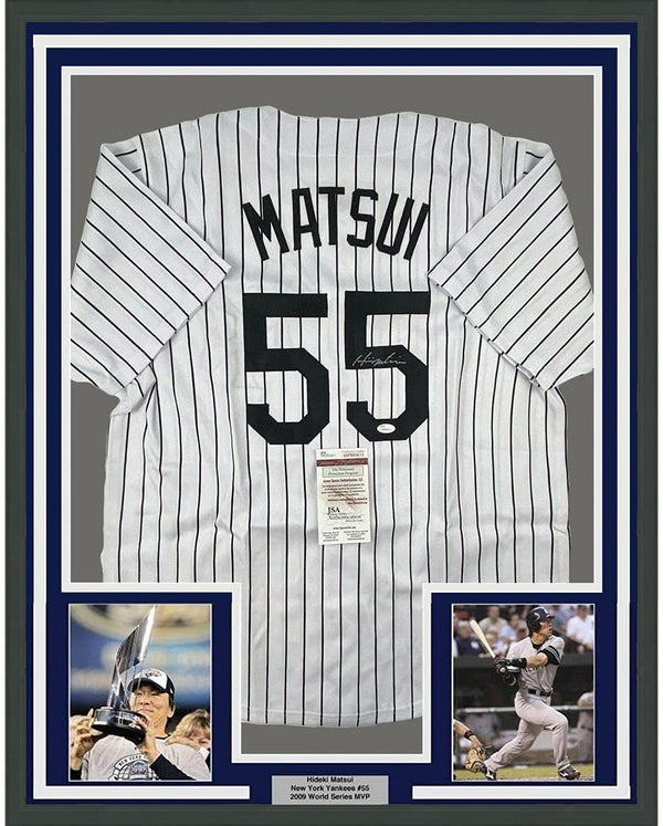 Framed Autographed/Signed Hideki Matsui 35x39 New York Pinstripe Baseball Jersey JSA COA