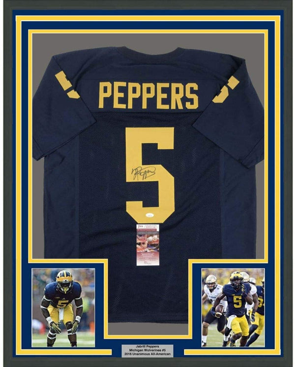Framed Autographed/Signed Jabrill Peppers 35x39 Michigan Blue College Football Jersey JSA COA