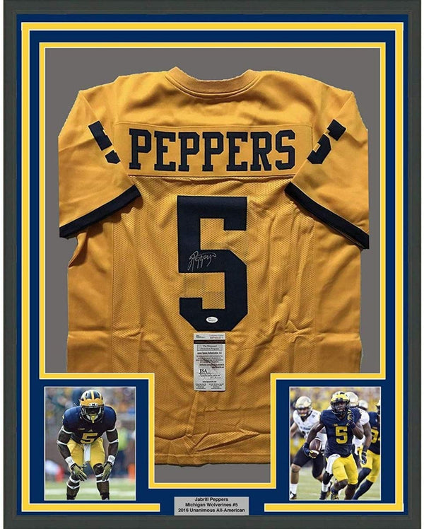 Framed Autographed/Signed Jabrill Peppers 35x39 Michigan Yellow College Football Jersey JSA COA
