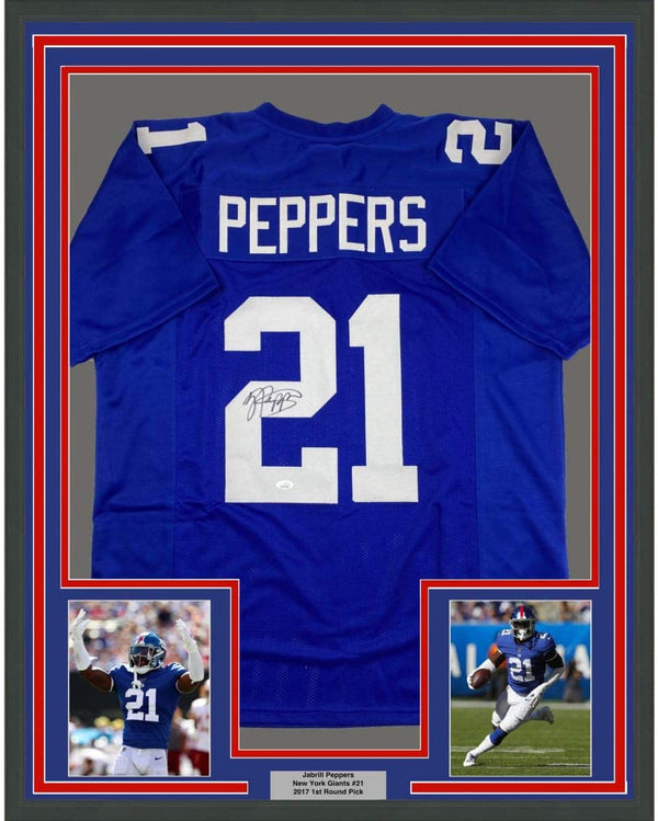 Framed Autographed/Signed Jabrill Peppers 35x39 New York Blue Football Jersey JSA COA